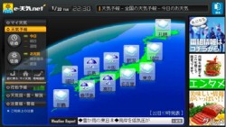 また気象情報サービス「e-天気.net」もサービスに追加。テレビの特性を活かした高精細な静止画による気象情報を提供し、基本情報に加えて、花粉予報や防災情報、インターフェイスに音声ガイダンス機能や“雨”の予報時に雨の効果音を出して天気を表現するなどの機能を装備した。また、2月15日からは、気象予報士やタレントを起用したオリジナルの気象情報番組をVODで提供する予定という。