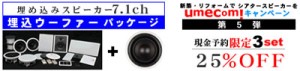 同ショップでは、埋め込みスピーカーの新築やリフォーム環境での導入を推進するため「新築リフォームでシアタースピーカーを埋め込む!キャンペーン」を開催している。今回はそのキャンペーン企画の第5弾として、埋め込みスピーカー7chシンプルパッケージにSWANS VX10-SWを追加した「埋め込みスピーカー7.1ch埋め込みウーファーパッケージ」を、通常価格の25%の特別価格で限定3セットのみ販売する。埋め込みウーファーに必要な取り付け説明書も同梱される。