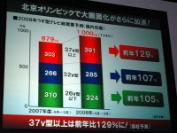 また同社の調べによれば、国内市場における37V型以上のフルHD化は目覚ましく、特に50V型以上は91%がフルHDモデルとなっている。西口氏はこれらを受け「昨今は大画面化が急速に進んでおり、37V型以上ではフルHDが当たり前になってきている」と分析。さらに「過去、オリンピックの年にテレビが売れなかった例はない。アテネ五輪の例を鑑みても、北京五輪に向けて薄型テレビ需要が一層拡大することが予想される。この需要によって大画面化がさらに進み、2008年度は37V型以上のモデルが約4割を占めるようになるだろう」と予測した。今後の需要増に備え、既に発表されている、建設中の尼崎の第5工場(プラズマ生産)と姫路工場(液晶)などにより、万全の生産体制を整えているという。