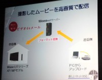 Wooonetの目玉サービスとなるのが、「ビデオdeメール」サービス。PCからWooonetのサーバに動画をアップロードすると、サーバ側で、Wooo薄型テレビで視聴可能な形式にフォーマットを変換。視聴が可能になると、あらかじめアップロードする際に登録しておいたWoooユーザーに、ビデオメールが到着したことを知らせる。遠方にいる両親に、子供のビデオをかんたんに視聴してもらう、などの用途を想定している。なお、同サービスは動画をアップロードする側が有料会員登録を行う必要がある。料金は未定だが、月額315円程度を予定している。