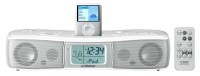 【SPEC】●実用最大出力:4W+4W(ACダプター使用時) ●入力端子:AUX(φ3.5mm ミニジャック) ×1、iPod dock コネクタ×1 ●チューナー:受信周波数 FM76.0〜108.0MHz ●スピーカー:5cmコーンスピーカー×2 ●電源:DC 9V 1.5A (専用ACアダプター使用)、ACアダプター (AC100-240V 50/60Hz)、0.5 A、DC 9V (単3形乾電池×6)、DC 3V (ボタン電池 CR2025×1) ●消費電力:12W ●最大外形寸法:322W×72H×85Dmm ●質量:0.7kg