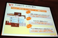 会場にはヤフー(株)取締役最高執行責任者の喜多埜 裕明氏が登壇しサービス提供にいたる経緯を説明し、「TVでインターネットを楽しむメリットとして、画面の大きさとパーソナルではなく複数人で楽しめることを挙げる。TV向けサービスに参入するにあたり「家族を意識したテレビ向けのサービス、リモコンひとつで利用できるわかりやすく簡単なデザインを追求した。またわかりやすさにこだわる一方で、テレビの表現力、高画質を活かしたサービスを展開しようと考え、フルハイビジョン対応のコンテンツを提供する」と述べた。