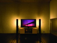 タワー型のスピーカーの中に照明が仕込まれており、薄型テレビと組み合わせたときに、画面付近をほんのり照らすことができる。写真のとおり、映像面と壁面の明暗差を和らげて、快適な視聴環境を生み出せるのだ。なお、照明はリモコン操作で100%〜20%の調光が可能となっている。