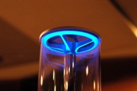 有機ガラス管にはイルミネーションが仕込まれており、ブルー、アンバー、パープルの3色に光らせることが可能。色はリモコンで変えることができ、また明るさを調整することもできる。