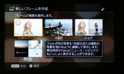 写真のフレームの場合、フォト、フォト+インフォ、シェア、思い出の4種類のフレームが作成できる。フォト+インフォの場合、「Yahoo!ニュース」のインデックス文字が画面端に表示され、必要に応じてブラウザで詳細な情報を表示することができる。また、シェアでは複数のフォトアルバムの写真を同時に表示することが可能だ。