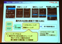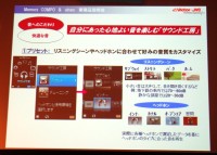 またユーザーのリスニング環境や、使用しているヘッドホンの種類に応じて、最適な音質をカスタマイズできる新開発の機能「サウンド工房」も採用。2パターンの設定が可能な「プリセット」と、より詳細なユーザー設定が行える「チューニング」の2つのモードを用意する。「プリセット」では「リスニングシーン」として、サブウェイ/ストリート/パーク/ルームの4種を、「ヘッドホン」はインナー/カナル/オープンエア/密閉の4種をそれぞれ選び、組み合わせによってユーザーに最適な音質をカスタマイズすることができる。また「チューニング」モードでは、周波数ごとにテスト音を聞きながら、試聴環境に最適な音質を追い込むことができる「簡単チューニング」と、L/Rバランスや周波数特性などを好みのバランスに細かく調整できる「詳細チューニング」の2つを設け、より細かいカスタマイズに対応している。測定結果はグラフ表示も可能。なお、「スタジオセッティング」モードの使用時に「サウンド工房」を合わせて機能させることはできない。