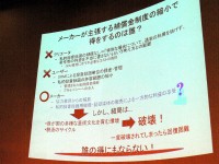続いて椎名氏は、ダビング10の実施容認に至った経緯についても説明。詳細はこちらでレポートしたとおりだが、その後、メーカーのバージョンアップの足並みが揃っていないという旨の報道を紹介し、「ダビング10開始が遅れた原因がメーカー側にあったという一部報道があったが、いまになって嫌にリアリティーを増しているなあ、という印象だ」とし、「急に決まったのでメーカーさんはびっくりしてしまったようで、なぜもっと早くキャッチできなかったのかという役所の声も聞こえてきている」と述べた。