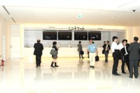 建物の中に足を踏み入れるとまず目に付くのは1階から3階までを貫く大きな吹き抜け。その吹き抜けの3階中央部分に、シャープの世界最大の業務用108V型液晶ディスプレイが設置され、映画の宣伝用映像が上映されている。また同じく3階ロビーのチケットカウンターには65V型液晶ディスプレイ、ドリンクやフードを販売する売店に52V型液晶ディスプレイを設置。真っ白な空間に鮮やかな映像が浮かび上がり、華やかさを演出している。