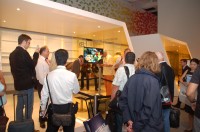BRAVIAの一斉展示や“ゴールデン・ショーケース”が外周を取り囲むホールを、さらに中央へ向かって分け入っていくと、広々とした“森”のようなスペースにたどり着く。四方を取り囲む白壁にはアンビエントな映像が映し出され、雷鳴やジャングルの生物たちの鳴き声のような聴覚・視覚のスペクタクルが演出される。時折ダンサーのパフォーマンスとともに、ZX1やSountinaなどハイライト商品の映像が壁面に映し出されるショウタイムもある。会場の床から天井まで延びる樹木を模した支柱の周りには、PS3やPSPなどゲーム機の体験コーナーや、“ウォークマン”、“ローリー”などソニーのユニークなオーディオが体験できるコーナーが設けられ、来場者をとことん楽しませる仕掛けも用意。まるで異空間に迷い込んでしまったような驚きのあるブースそのものに魅せられ、長い時間とどまっている来場者も多く見受けられた。