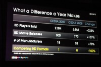 昨年のCEDIAの段階では200万台だったBDプレーヤーの台数が、今年は650万台となり、225%の伸びを示した。映画タイトルも300から770タイトルに増え、参入メーカーも18から32に急進したという。表の一番下にある「競合HDフォーマット」が、昨年の1から今年は0になり、「-100%」と記載されているのも、北米特有のジョークだろう。