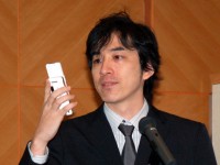 湯原氏は本サービスの特徴を「一元管理」「マルチデバイス閲覧」「共有」の3点であると説明。実際にその場で同僚のスタッフを携帯電話で撮影しアップロードするデモンストレーションも行った。