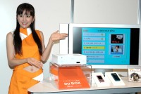 「au BOX」は、ひかりoneサービスの非加入者やブロードバンド環境が整っていないユーザーでも楽しめるよう、CDやDVDの楽曲をau携帯電話やウォークマンに転送できる機能などを搭載した“ケータイ専用アミューズメント・ボックス”。