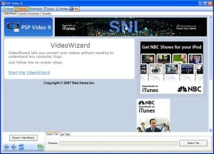 PSP Video9では、タイトルバー下のタブをクリックすることで、それぞれの機能のページに切り替わる。変換のためには「Convert」タブをクリックし、変換ページで表示させる。デフォルトではビデオウィザードが起動し、簡単な操作で変換できる。まずは、「Select File」をクリックし、ファイル選択ダイアログで変換したいファイルを選択する。