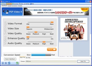 まずは動画変換だが、あまりPSPでの動画変換に慣れていない人であれば、前回も紹介しているフリーソフト「PSP Video9」がオススメだ。このソフトの特徴はビデオウィザード機能によって簡単に変換設定ができること。現在は4:3、16:9の2つのアスペクト比映像が現役で使われている時代だが、適正なアスペクト比で簡単に変換可能。また、変換後の転送までこのソフトで行うことができるのも便利だ。