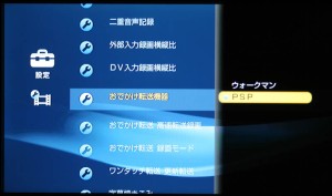 ソニーのブルーレイレコーダーBDZ-A70やBDZ-X100/X95/X90は録画タイトルをMPEG4 AVC形式に変換して、PSPやウォークマン(A820 シリーズに限る。また、X90はPSPのみに対応)に転送する「おでかけ・おかえり転送」機能を搭載している。