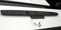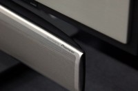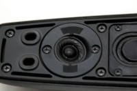 スピーカー部はパイオニアと共同開発した、新開発の薄型スピーカーを採用。右上にPioneerロゴもプリントされている。構成は3ウェイ5スピーカーで、2.1ch再生を行う。トゥイーターはφ2.6cmのものを2基、ミッドレンジはφ12×5cmのものを2基搭載。サブウーファーはφ7.7cmを1基備える。なお、トゥイーターはパイオニアのアドバイスにより、内側に14度傾けて配置したほか、ユニット周囲に波状の溝を彫り込んだウェーブガイド構造を採用。これにより指向性を広くすることに成功したという。
