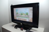 また同社独自の映像処理回路“GENESSA”エンジンの最新バージョン「GENESSA PREMIUM II」もデモが行われている。新しいエンジンでは、新開発の回路「i-Shadow」を搭載。映像の物体ごとに明暗を強調することにより、精細感とコントラストを向上させている。本エンジンについては2009年に欧州で発売される同社の液晶テレビから搭載が予定されているという。今回は42インチの同社スリム液晶テレビをベースにした試作機で、回路をON/OFFした映像を2画面表示し、比較視聴できるデモが行われている。