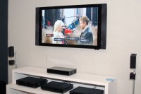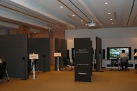 11:30/14:30/17:30には、AV評論家の貝山氏によるセミナーが開かれた。こちらは立ち見も出る大賑わい。プラズマモニターディスプレイ「KRP-600M」を3面に配置し、スピーカー「S-1EX」をフロントに据えた5.1chサラウンドシステムが鎮座。BDプレーヤーは「BDP-LX80」、AVアンプは「SC-LX90」という、パイオニアの現行フラグシップホームシアターシステムが揃っている。