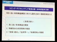 事業本部の方針について説明したのは梅村氏。省エネと環境を基本とした新しいライフスタイルを提案するオンリーワン商品の開発などで真に強い事業構造を構築すること、ディスプレイ事業の国内トップシェアブランドとして持続性ある成長戦略を推進すること、倫理および遵法や品質第一、そして危機管理の精神を徹底することを基本方針としていると語った。