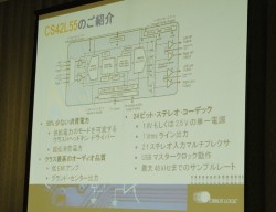 また、携帯オーディオ向けコーデック「CS42L55」も発表された。本製品は24ビットで、無音再生時の消費電力を5.1ミリワットという低消費電力を実現している。また同社が2つのモードを持つクラスH技術を採用し、携帯機器に採用されているクラスA/Bアンプと比べ、消費電力を50%近く低減可能という特徴を有している。同社では本製品を携帯型メディアプレーヤーやナビゲーション機器、ワイヤレスヘッドセットやゲーム機などの製品開発向けに提案しており、量産を既に開始している。出荷単位は36ピンのxQFNパッケージで、10,000個注文時に1.73ドルの単価で販売される。