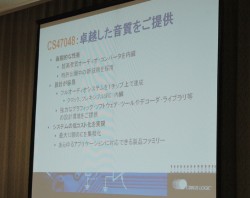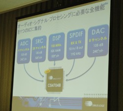 「CS47048」はオーディオアンプ向けのSOC(システム・オン・チップ)新製品。32bit対応シングルコアのオーディオプロセッサーと、マルチビットのΔΣオーディオコンバーター、デジタルオーディオレシーバー/トランスミッターを内蔵しており、同社では車載用途のオーディオアンプへの展開などを提案している。プロセッサーにはカスタマー用のプログラミングツールも付属し、設計者にとってはアンプの実装に必要なICの数をチャンネル数や信号処理に合わせて削減でき、シンプルな設計を可能にするという。またDAコンバーターやADコンバーター、DSP、メモリー、SPDIFを含むチップの削減が可能になり、基板スペースとシステムコストの大幅な低減が可能になる点もメリットとして訴求されている。