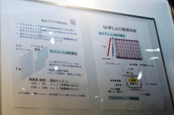 目玉はなんと言っても同社独自開発のPTA(プラズマチューブアレイ)方式による大画面フィルム型ディスプレイ「シプラ」。幅3m×高さ1m、125型の大画面ながら、表示部の厚さは1m、質量3.6kgと非常に軽量だ。画素数は960×360となる。