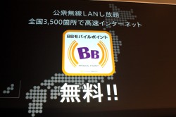 また、iPhone関連サービスとしては、全国に約3,500ヶ所ある公衆無線LANポイントのBBモバイルポイントを、iPhone 3Gユーザーには11月4日より無料開放することも明かされた。