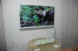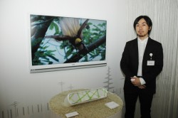 同技術は「TVラックとソファの間」など、リスナーとスピーカーとの距離が比較的近接した小空間においても、高品位なサラウンド再生が楽しめるよう開発されたものである。今回展示されたモデルのコンセプトについて、デザインを担当した同社デザインセンター 商品デザイングループ 土屋人詩氏は「本機の独特なサラウンド音場により、ディスプレイに映し出された映像の世界に巻き込まれるような効果を演出したいと考えました」と語る。今回のイベントでは薄型テレビで環境映像を再生し、「komorebi」によるリアルなサラウンドの世界を味わうことができる。