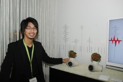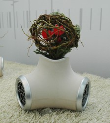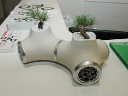 本体エンクロージャーの材料には、プラスチックに植物廃材を混ぜてダイオキシンの発生を抑えた「エコプラスチック」が用いられている。また塗装も省くことで、エコ仕様も徹底されているという。本体上部には着脱式のカップを置き、植物を生けるデザインとなっているので水漏れの心配はないのだという。2つのスピーカーどうしを背面端子部に設けられたフックで繋いで設置することもでき、商品化されれば部屋の中で様々なレイアウトが楽しめそうだ。