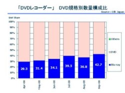 ブルーレイ・ディスク・アソシエーション(BDA)は、国内DVDレコーダー市場におけるBD対応レコーダーの9月度の販売台数のシェアが前月比5.9%増の42.7%となり、月次の調査として初めて40%台を超えたことを発表した。