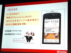 「iコンシェル」は、ユーザーの生活エリアや趣味思考に合わせた情報を配信するというもの。レンタルしたDVDの返却日や好きなアーティストのライブ情報、通勤通学に利用している鉄道の運行状況などの様々な情報を、キャラクターがコンシェルジュのように待ち受け画面で知らせてくれる。