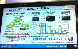 日立は液晶テレビ“Wooo UT”シリーズについて、薄さ35mmの薄型軽量ボディにより輸送効率を向上させていることなど環境性能をアピールしている。消費電力低減モードを搭載し、現行モデル「UT37-XP770」と07年発売「L37-XR01」を比べると、年間消費電力量と年間CO2排出量を約17%削減している。