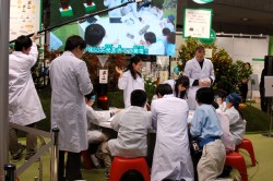 ワークショップの様子ソニーのブースではみかんの皮から抽出した色素で色素増感太陽電池をつくり発電の体験を行うワークショップが行われ、多くの来場者で賑わっている。