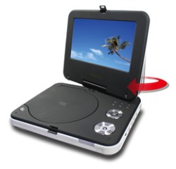 本製品は、ディスプレイ部を水平方向に180度回転させることのできるポータブルDVDプレーヤー。付属の車載用バッグを使用すれば車のヘッドレストに取り付けることもでき、後部座席の搭乗者が車内でDVDを楽しむといった使い方が可能だ。