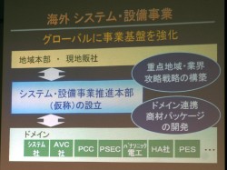 これは一見、グローバル化を掲げる「GP3計画」の方向転換ともとれるが、大坪氏は「(方針は)変えるつもりはないし、目指してきた姿も間違っていない」と発言。新たにドメインと各地域本部・現地販社の間に「システム・設備事業推進本部(仮称)」を設け、ドメイン連携商材パッケージ開発や地域ごとの戦略構築を行うことにより、グローバルの事業基盤強化へ繋げる計画を発表した。
