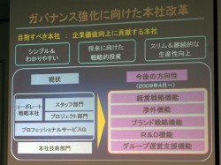 アメリカの金融危機に端を発した景気の低迷する現状を同社は「不況による需要縮小と、新興市場拡大や低価格製品への消費志向シフトなどといった市場構造変化が同時進行している」と分析しているという。大坪氏は「今必要なのは、今後の市場構造変化に対応できる事業構造の構築」と発言。複眼的な事業評価を行い、伸ばす事業と撤退する事業を明確化。シンプルかつ生産的な体制を目指し、今年4月より組織再編を行うことを明らかにした。