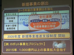 グループ内のシナジー効果をより高めるための施策も実施。AVC社、パナソニック電工といった各ドメインと本社、本社R&Dが連携した「ものづくりイノベーション本部」や、2009年度より開始する「新規事業推進支援制度」によって資金/人材的支援を行い、ロボット事業などといった新規事業創出の強化を狙う。