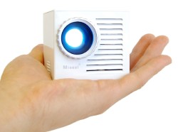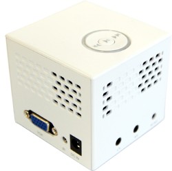 本体サイズ68W×68H×D70mmの小型LCOSプロジェクター。投写距離は0.3mから5m、画面サイズは7から112インチに対応する。解像度は800×600画素で、輝度は25ルーメン、コントラスト比は100対1。