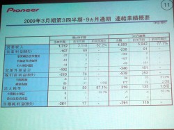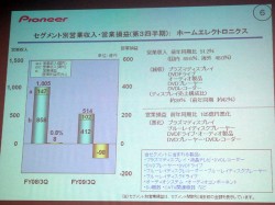 小谷社長は3Qの結果を「サブプライムローンに端を発した世界的消費冷え込みや円高の影響」と説明。なかでもカーオーディオ/プラズマディスプレイ/DVDドライブなどの売り上げが低迷したことが大きな原因だという。四半期別の連結営業収入推移表を見ると、2008年度3Qのホームエレクトロニクス事業業績は、昨年度比約半減となる48.8%。特に海外での営業収入45.8%減が大きく響いており、経済不況のあおりが直撃した印象だ。