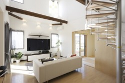 (上写真)螺旋階段が素敵なこのお宅、吹き抜けにホームシアターがあるんです! 素敵なコーディネートですが、スクリーンをあげるとさらにこだわりを感じさせるインテリアが顔を出すのです。その模様や、吹き抜けでの音響設計の秘訣については、本誌をご覧ください!