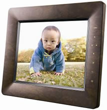 8インチTFTディスプレイを搭載した光フォトフレームで、画面解像度は800×600ピクセル。内蔵メモリーは64MBで、そのうちユーザーメモリが32MB、E-mailメモリーが32MBという内訳。無線規格はIEEE 802.11 b/g。本体にはUSBポートを装備している。電源は外付け電源アダプター(12V、2A)を使用し、消費電力は10W(通常時)。