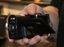 JVCはPMA09の同社ブースにおいて、バッテリー込みの撮影重量がわずか300gのフルHDビデオカメラ“EverioX”GZ-X900を発表した。本機はCES2009でもサンプルとして出品されていたもので、そのデザインはスリムかつ斬新。モニターを閉じればボディはフラットになり、高い収納性を確保している。