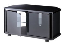 部屋の角へ設置するケースに配慮し、コーナー部分をカットしたデザインを採用。カラーはスタンダードな黒で、ガラス棚板1枚のほか転倒防止ロープとキャスター受皿4枚が付属する。
