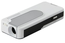 バッテリー込みで重さ160g、サイズは50W×23H×115Dmmtと軽量小型の手のひらサイズのプロジェクター。画素数は640×480、アスペクト比4対3、輝度10ルーメン。