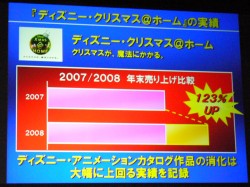 作品説明に続いて井上氏は、今冬に実施した「ディズニークリスマス@ホーム」キャンペーンの成果についても報告。キャンペーンを行った2008年は、2007年に比べて年末の売り上げが123%向上したことを紹介。