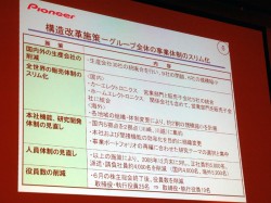 また役員についても、現行の取締役・執行役員計25名から、今年6月の株主総会後には19名に削減する予定だ。元社長の須藤民彦取締役も退任予定者リストに連なっている。「須藤体制からの決別を図るのか」と問われた小谷社長は「パイオニアの新しい出発に向け、新しいメンバーで向かって行きたいと考えた」とコメントした。