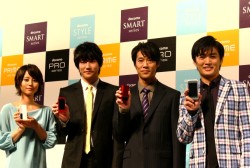 SMARTシリーズ「N-09A」を手にとった堤さんは「僕自身はそんな洗練されたスマートな大人だとは思っていないが、この携帯は本当にスマート」と絶賛。