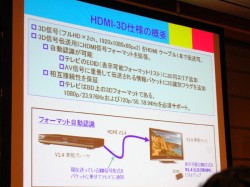 つまり実際の製品では、HDMI 1.4で3D対応BDプレーヤーと対応テレビを接続すると、3Dフォーマットを自動認識し、自動的にそのフォーマットに合致した表示方法に切り替わるということになる。ただし、「HDMIの規格化と同時にBDの規格化も進めないと、この自動認識が働かず、ユーザーにとって使いづらいものになる」とし、BDの3D規格早期策定が必要であることを強調した。