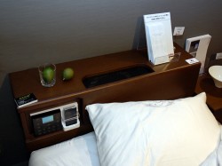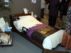 寝室での使用場面をイメージした「寝室ゾーン」では、フランスベッド(株)が特別に製作した製品埋め込み型のベッドを展示。このベッドは頭部に埋め込んだスピーカーを手元のアンプで操作するというもの。「最も音の良いベッド」と同社説明員が胸を張る同ベッドを実際に体験することができる。