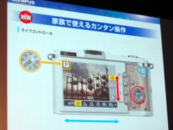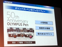 本日開催された発表会で製品説明にあたった同社SLR事業本部 本部長の小川治男氏は「小さいだけでなく、デザインにもこだわった」とし、往年の「オリンパス・ペン」が醸し出していた高い質感、凝縮感を表現しながらも、懐古趣味ではなく、最先端を行くデジタルカメラであることが伝わるデザインを目指したと説明した。